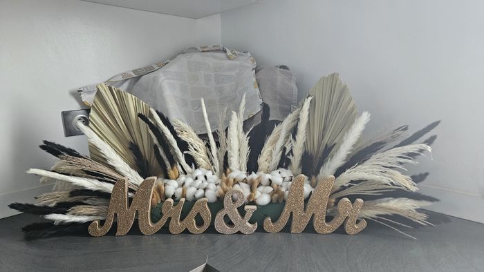 Bonjour à toutes et tous J'aurais besoin de vos avis concernant mon centre de table. Il n'est pas encore finit il me reste le centre à faire. Je trouve malheureusement que les fleurs séchées sont trop ton sur ton par rapport au MRS & MR.Merci...