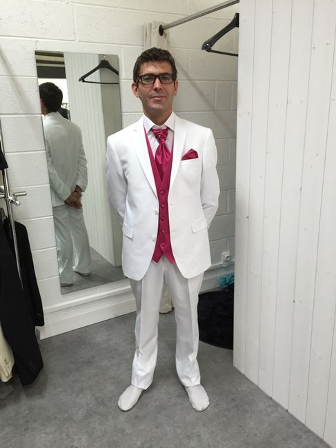 Coucou mon chéri à essayer son costume aujourd'hui et je voulais vous demander votre avis pour savoir si il sera en accord avec ma robe ou pas ?