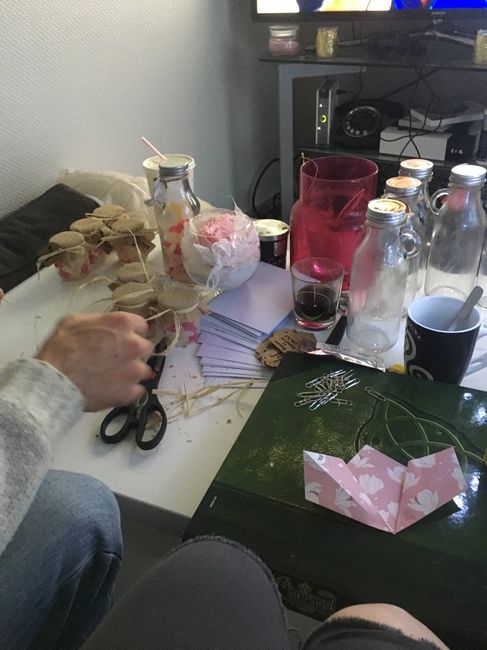 je touche la fin enfin finis mes contenants pour les fleurs 🌺 en centre de table toile de jute coupé à bonne longueurs reste plus que que les cadeaux invités je ne sais toujours pas si j'en faiS ou pas