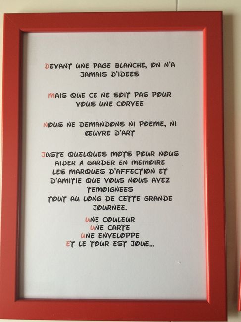 Bonsoir à toutes ! J'ai besoin de votre aide je vous explique voici notre livre d'or (si on peut dire ) j'aimerais mettre une petite pancarte sur la table ou il sera pour dire au gens de nous laisser un petit mot mais je ne sais pas comment...