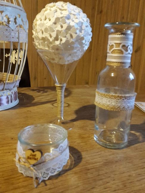 Essaie de customisation de mes différents éléments du centre de table. Le petit pot contiendra une bougie Led. Il y aura un fond de sable rose poudré sans le fond du verre sous la boule fleurs et une rose naturelle avec du gypsophile dans la...