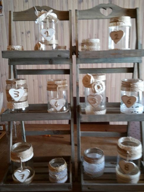 Bien avancé pour mon plan de table aujourd'hui!!Les bocaux seront remplie d'un peu de sable où je piquerai des pics à brochette où seront collé les noms des personnes. Qu'en pensez vous?