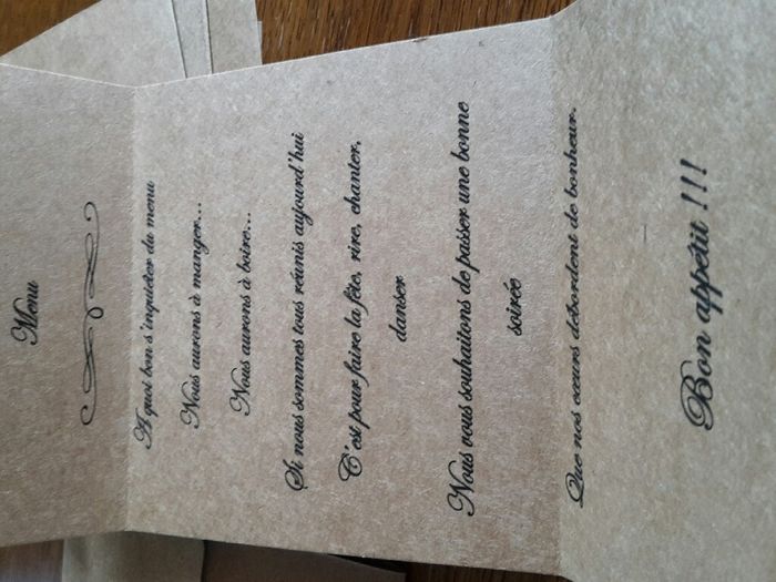 Voici mes faux menu! Contente du résultat ! Je cherchais de jolies noms pour chaque plat puus je suis tombé sur ce texte que lune d'entre vous avez mis sur ses menus et j'ai tout dd suite accroché donc j'ai copié le texte!!!