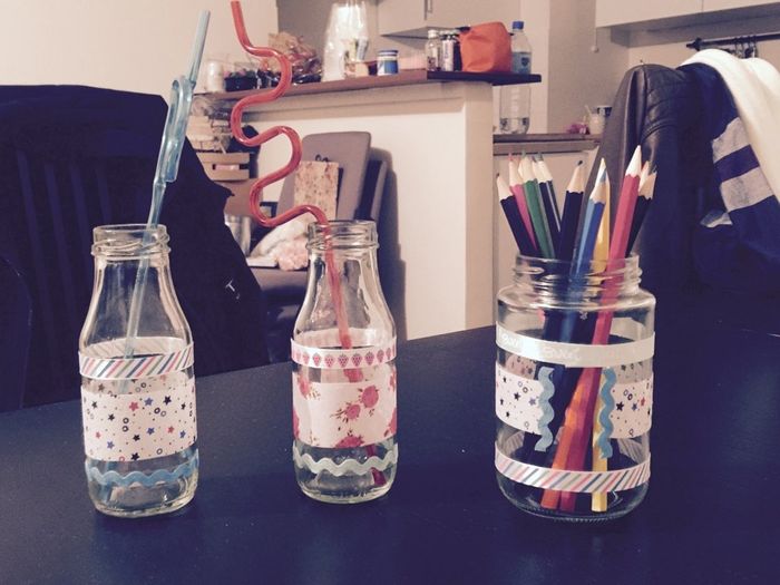 Coucou les filles! Ce soir je vous montre mes essaies pour la table des enfants. Je voudrais une table pleine de couleurs, et avec au centre des pots à crayons et des coloriages. Et pour chacun des enfants une petite bouteille en verre customiser!...