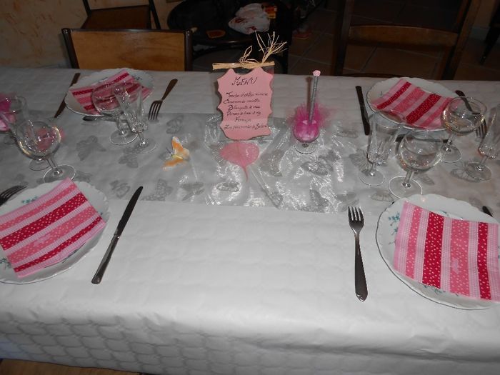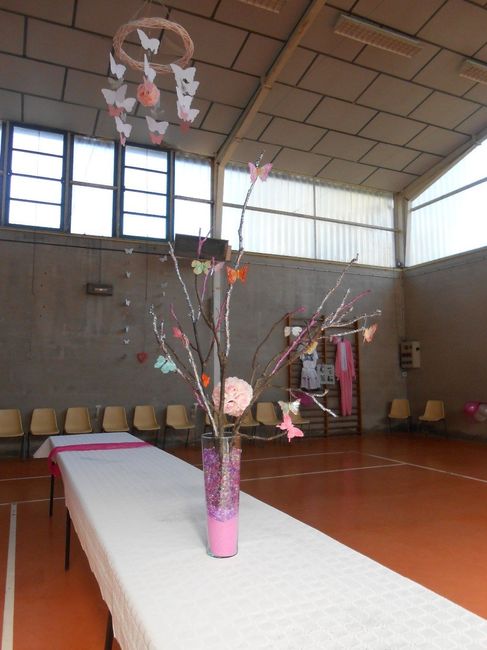 ...Et on récupère la déco du mariage ! Après tout on l'a la déco, elle est rose, blanche et argenté, ça colle aussi pour un baptême. Le curé avait refusé de nous baptisé notre dernière pendant le mariage ( c'est de plus en plus refusé ça), on l'a...