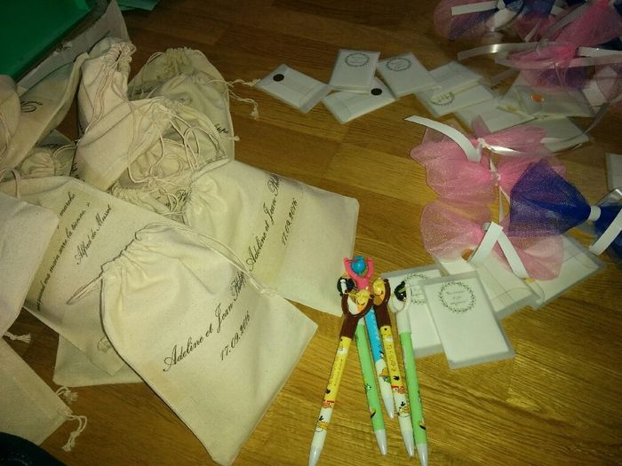 En plein préparatifs de mes welcome bags avec des pochettes larmes de joie, les noeuds de voiture et les stylos. Il ne manque plus que les étiquettes pour l'arbre à voeux.