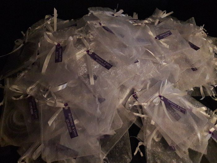 Hello la commu!! Ce soir c'est atelier noeuds!! Petits noeuds auxquels j'attache une étiquette de notre mariage. Je vais les coller sur des sachets en tulle blanc dans lesquels je mettrai mes cadeaux invités!! Pour l'instant je suis à 96, encore...
