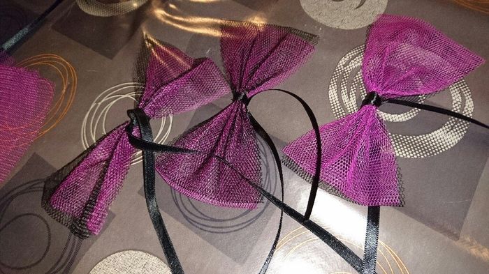 On est quand même pas mal à faire nos petits noeuds pour le plaisir de nos invités ! Chacune sa technique, alors voici la mienne pour celles que ça intéresse Se munir de 2 rouleaux de tulle et d'un ruban à vos couleurs bien sûr. Couper une bande...