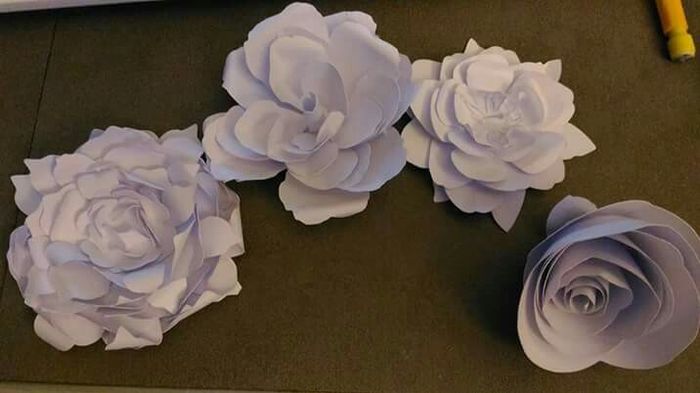 Mon premier essai de fleurs de papier 3D. C'est long à faire, mais c'est vraiment sympa. J'ai dans l'idée de les coller sur les rubans qui maintiendront l'organza sur les chaises.... je ne sais pas encore si je les fait en blanc ou en gris.... (notre...
