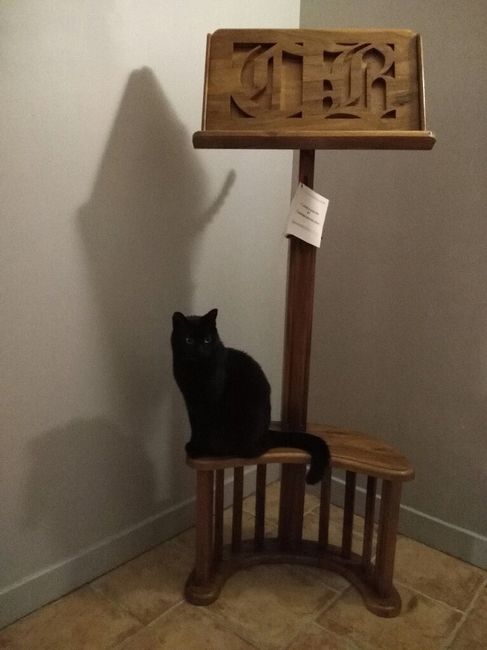 Je vous présente le Pupitre pour ma cérémonie laïque. Il s'agit d'un Pupitre fait par mon père pour mes 18 ans, avec mes initiales. Évidemment, mon chat restera à la maison, lui