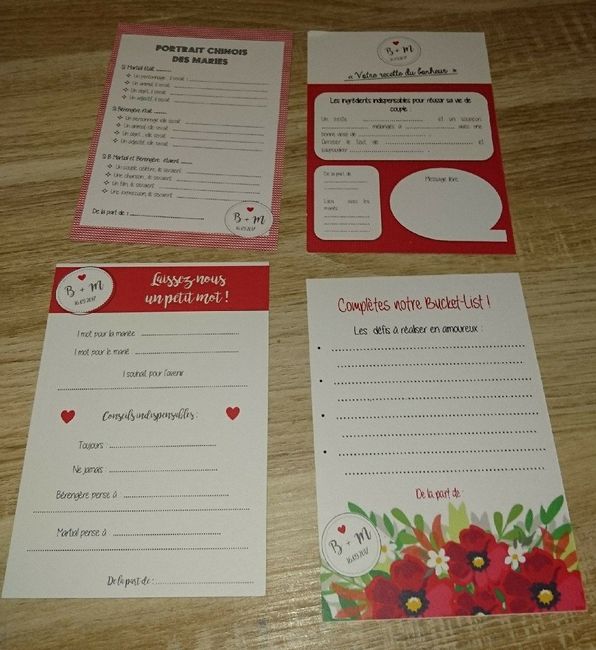 Coucou, Aujourd'hui nous avons reçus les cartes à completer par nos invités pour le livre d'or. Je suis très contente du résultat. Je les ai réalisées sur PowerPoint et pour l'impression nous sommes passés par vistaprint. Il y aura aussi de jolies...