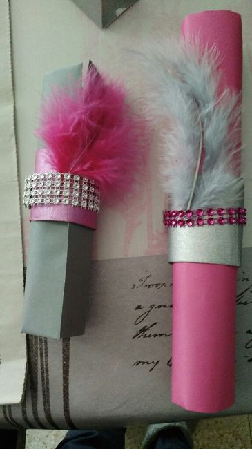 Bonsoir a toutes,Mon mariage étant le 5 août ,voici les premiers essais réalisés . - contenant a dragées ( le 1 et la plume sera grise) et jalternerai 1 sur 2- mes ronds de serviettes pareil 1 avec plume grise et jalternerait aussi - la pochette de...