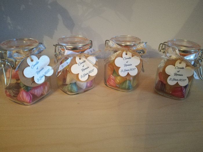 Voilà les petits cadeaux pour mes invités : petits pots Action 1,99€ les 4; berlingots trouvés sur le net environ 15€ les 2kg; étiquettes craft "thank you" environ 2€ les 100; et l'autre étiquette faite par moi-même ^^ Et hop le tour est joué ! ...