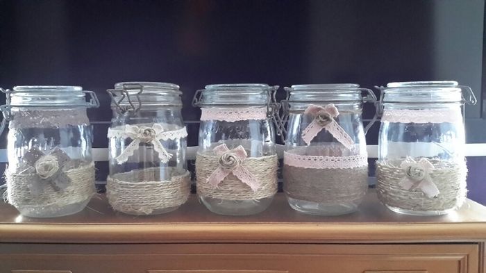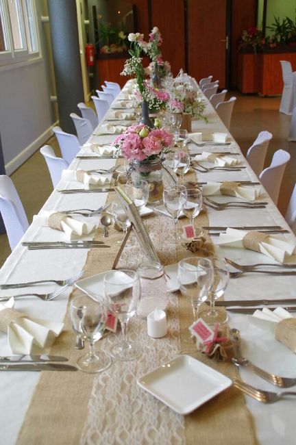 essai deco de table à j-7... à imaginer avec les couverts et les fleurs dans les bocaux et les bouteilles... et Les tables seront rondes.. et deux rectangulaire.
