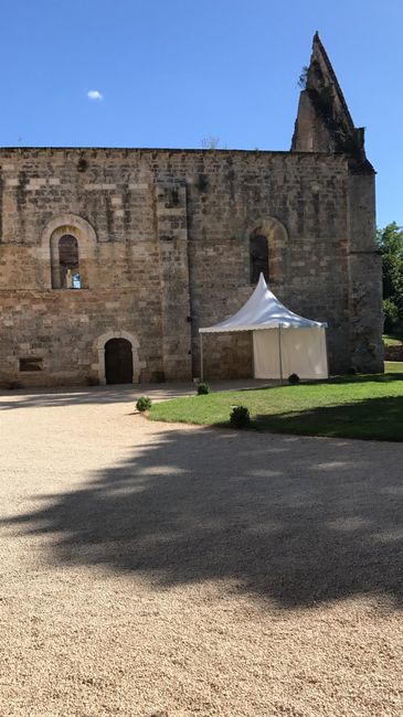 Panoramique Ma coiffureNotre abbaye pour la cérémonie laïque Arrivée à la mairie à pieds avec mes DH et témoins Sortie de mairie et ma belle robe noire Attente pour rentrer dans l'abbaye Vin d'honneur Sortie d'abbaye Equipe de hand, main sur le...