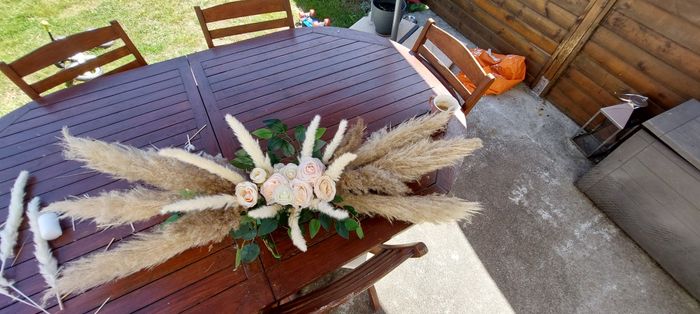 Hello tout le monde. Me revoilà avec encore besoin de votre avis ! Heureusement que vous êtes là . Ahaha 😅Je suis perdue sur ma decoration de table. J'ai simuler sur ma table. Il y aura une nappe blanche. La pampa sera plus "fraîche" car la c'est...