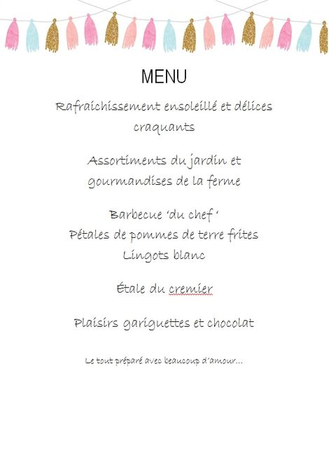 Hello les BTB et GTB ! Aujourd'hui je réfléchis à la mise en page de mon menu de mariage. En m'inspirant de cette idée : Menu serviette Voilà mon tour de serviette à moi, enfin le texte ! Qu'en pensez vous ? Menu bandeau