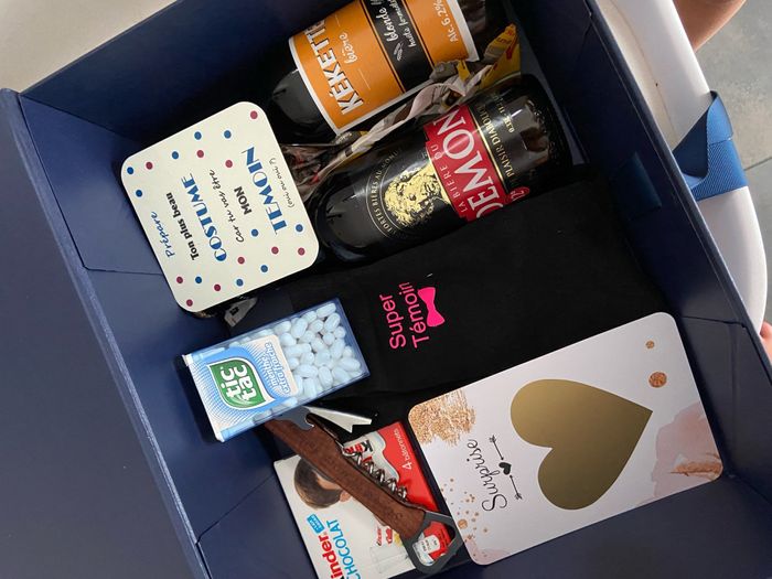 Box témoins filles et garçons Box filles:- carte a gratter (veux tu être ma témoin ) - trousse personnalisé fait maison - miroite grossissant personnalisé -bière x2 -porte clé en macramé -kinder / tic tac - masque visage -carnet de note Box témoin:...