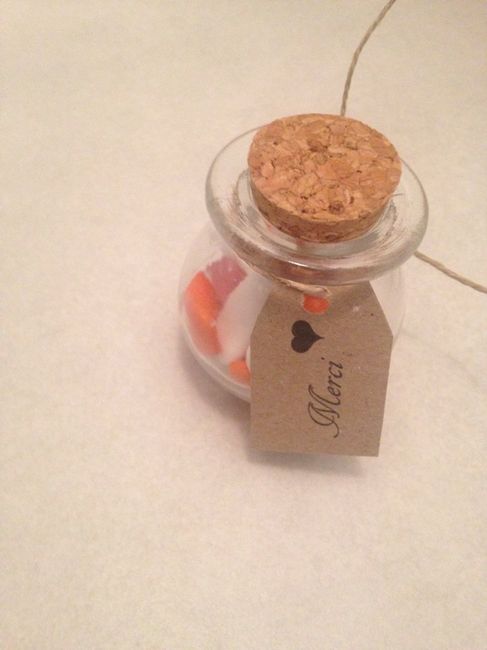 Nous sommes assez traditionnels donc on voulait des dragées. Le tout pour moins de 2€/ personne. Le contenant était à 0,75€, un peu de la ficelle, des étiquettes faites maison, des dragées tout chocolat oval blanc et des petits cœurs rose et orange...