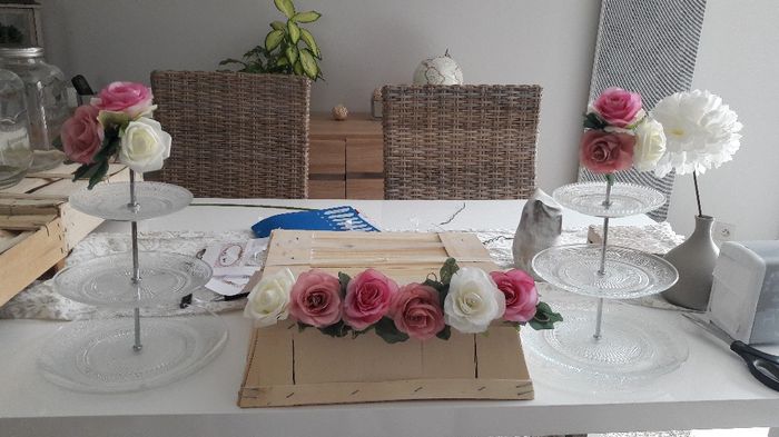 Bonsoir.Essais ce soir pour la table du cindy bar et la table de l'urne et du livre d'or. Il y aura des pompons au mur pour donner de la hauteur.Qu'en pensez vous?
