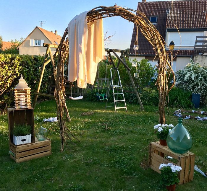 Bonsoir les Filles,Premier essai pour notre arche de cérémonie laïque. Nous aurons plutôt du tulle blanc très léger à la place de la nappe de ma Maman (c'était juste pour essayer!!).Qu'en pensez vous??Merci