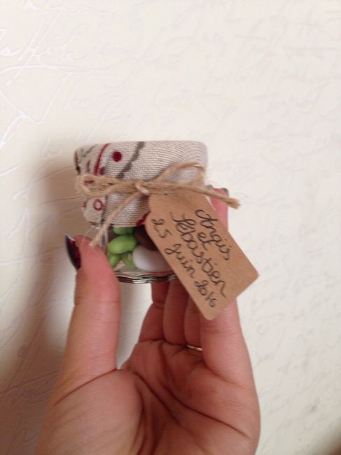 Aujourd'hui je le termine tous plus qu'à finir de mettre les ficelles faire le noeud et apporter les prénoms avec la date il en reste 100. Les pots sont des mini pot de confiture recouvert d'un morceau de tissu ??