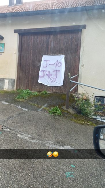 Se matin je me lève ^^ et je vais à la poste de mon village à pied et en sortant de chez moi ,je suis attiré devant un gros truc blanc ^^ nos témoins sont venue dans la nuit nous installer un gros draps sur notre porte de grange 🤣 t + j " j-10" 🤣 sa...