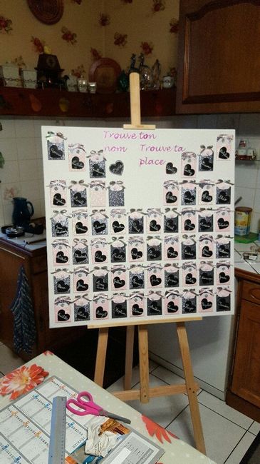 BonjoursJuste un petit poste pour avoir vos avis concernant notre urne de mariage ainsi que notre escort card qui lui et en fabricationDoit ton rajoute une decoration en arriere plan , en haut sera ecrit trouve ton nom trouve ta place en pailette...