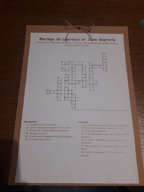 Nous avions mon conjoint et moi trouvés l'idée des mots croises pour voir si nos invités nous connaissent bien sympa, voilà le passage de l'idée à la réalisation faite! Nous en disposeront un par table avec sûrement un cadeau à la clé (mais pas...