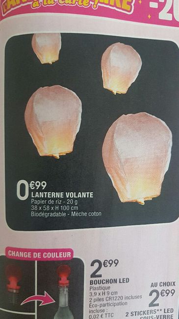 Hello les filles !Pour celles que ça intéresse, les lanternes volante sont à 1 euro dans les magasins la Foirefouille ! Du 1er mars au 11 mars dépêchez vous 😉