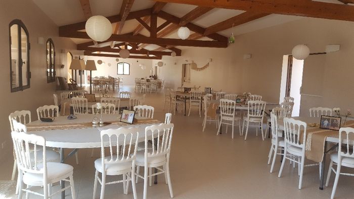 Bonjour à toute et voilà ça yest notre grand jour est la 😊apres 2 ans de preparation nous y sommes je suis très heureuse mais le stresse ne m'a pas vraiment laisser dormir... Voici quelques photos de la salle (il manque les nappes que le traiteur met...