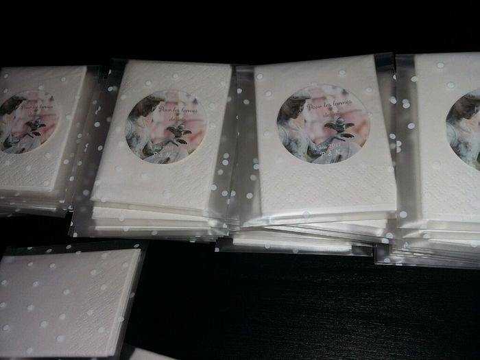 Après les sachets à confettis et les tickets de la.loterie pour la jarretière voici nos mouchoirs pour larmes de joie ! Merci aliexpress pour tes pochettes déjà toute faite et en plus autocollants et mes stickers vistaprint le tout pour 6 euros que...