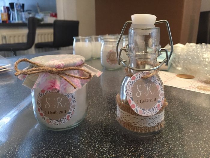 Bonjour Voici les prototypes que j'ai réalisé pour mes cadeaux aux invités. Une bougie fait maison pour les femmes et une fiole (je ne sais pas encore quoi mettre dedans) pour les hommes. Qu'en pensez vous?
