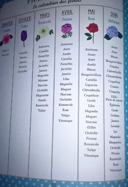 Salut les filles, Si comme moi vous ne savez pas quelles fleurs fraiches choisir pour votre déco et votre bouquet, voici un calendrier que j'ai dégotté dans un bouquin spécial organisation de mariage à la bibliothèque du coin, espérant que cela vous...