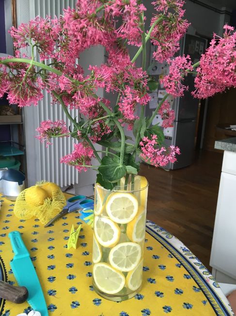 Hello les filles,Hier j'ai fait un test avec les vases qui seront au centre de la table (avec d'autres). Pour rester dans mon thème jaune et car j'adore le citron, on a coupé des rondelles et on les a mises au bord du vase. Cest une feuille rigide...