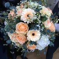 Il y a 3351 joursBonjour, Voilà le bouquet qu'il y aura sur nos centres tables. Thème champêtre, couleur pêche. Je suis fan ! Et nous avons essayé les noeuds couleurs pêche qu'il y aura sur les chaises invités. Sur notre table d'honneur ce sera des noeuds gris pour...