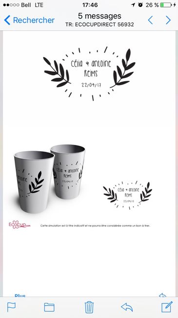 Bonjour les Btb! Nous avons reçu nos gobelets personnalisés qui seront utilisés par les invités aux mariage et ils pourront repartir avec en guise de cadeau! Je vous recommande le site ecocup! Super service et commandé traitée rapidement! Xxx ...