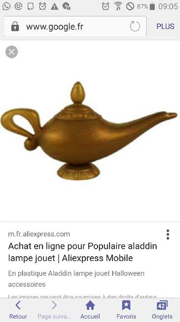 Bonjour, Le thème de notre mariage c'est les contes de fées, et je cherche à réaliser moi même un contenant ressemblant à une lampe d'aladdin, ou bien à acheter une lampe d'aladdin ou une lampe à huile, mais pas trop cher. Donc si vous avez des...