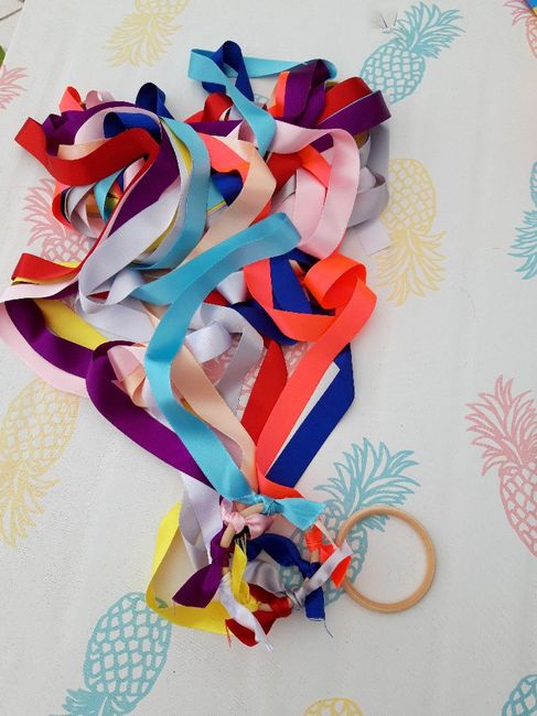 Hello a tous je vous partage ce que j ai fait...la nouvelle version du jeté de bouquet j ai acheté 2 anneaux chez cultura un pour les rubans biensur et un qui sera pour le fleuriste avec 10 rubans différents 😁