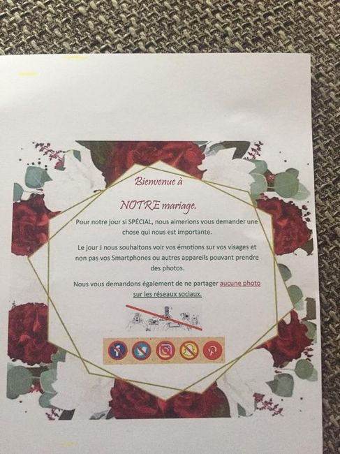 Coucou les filles Je viens de recevoir le contrat de mon prestataire photographe. Je suis vraiment très surprise de lire qu'il nous demande, de demander à nos invités de ranger leurs téléphones, tablettes et appareils photos durant la cérémonie......