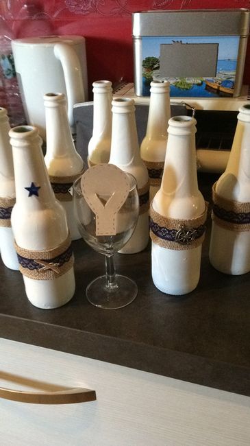 Cc mes premiers test diy pendant la sieste de bébé, bouteilles de bière que j'ai bombées je vais sûrement rajouter des rubans et mettre d'autres étoiles pour cacher les coulures ? Et mon mariage est sur le thème du voyage alors Marque place...