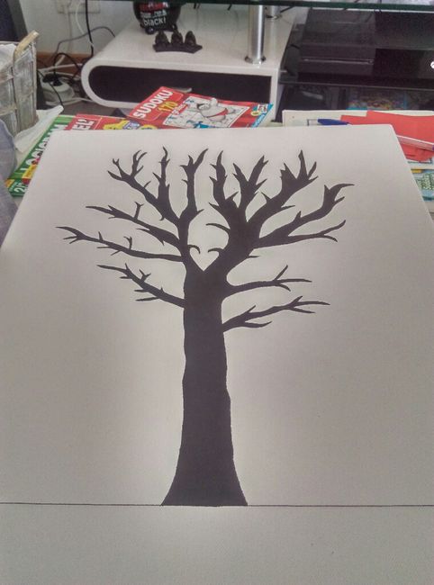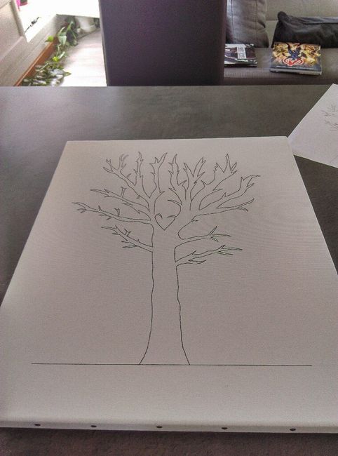 Bonsoir les filles, aujourd'hui j'ai dessiné notre arbre à empreintes par la suite je vais le remplir complètement en noir ! Ensuite je rajouterai nos prénoms et la date sous la ligne ! Le faire nous coûte bcp moins cher que de l acheter sur Internet...