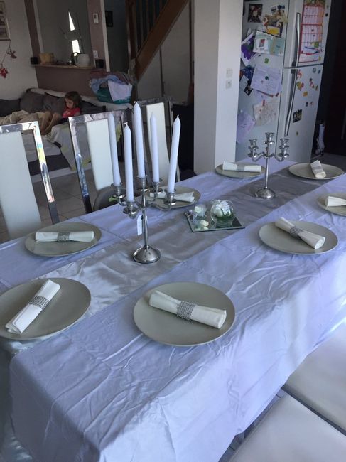 Bonjour à tous, J'aurai voulu votre avis sur mon essai de décoration de table sachant qu'il manque les couverts, les verres, les portes noms., les assiettes seront blanches le jour j.Je pensais laisser comme ça et rajouter quelques petits diamants. ...