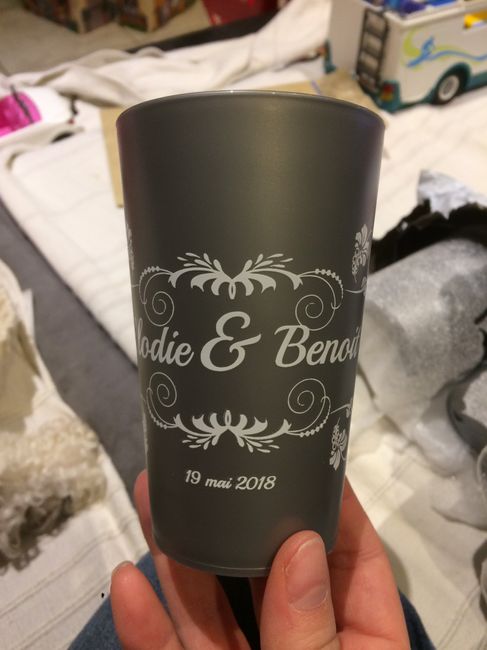 Je viens de recevoir mes gobelets personnalisés. La photo est trompeuse les gobelets sont bien argent. Voici le résultat j'adore! Couleur de notre mariage: argent et blanc