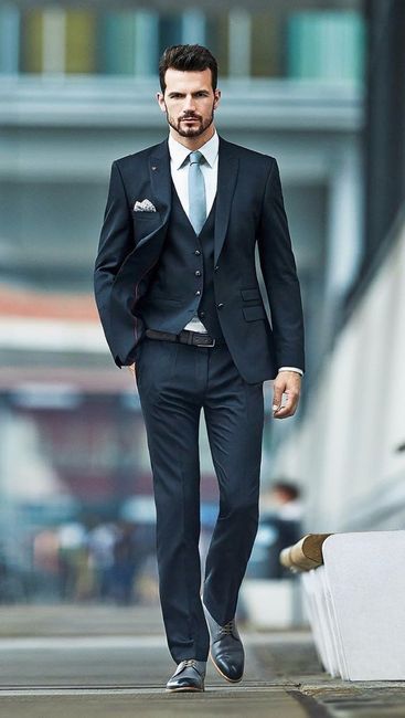 Voilà le look que je rêverais que mon chéri ait le jour de notre mariage. C'est exactement ça. Un costume bleu, le gilet ; j'adore les gilets, je trouve ça super élégant ; une cravate vert menthe, un joli mouchoir. On change les chaussures pour du...
