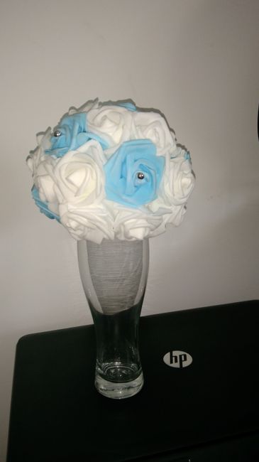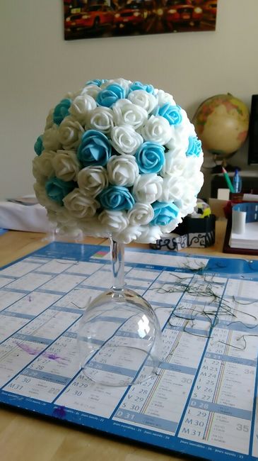 j'ai fait mon test de boules de roses en blanc et bleu, j'adore, bon je trouve que pour un centre de table sa fait petit (la boule fait 10cm de diamètre plus les fleurs), je vais surement en faire deux par table, par contre d'après vous combien de...