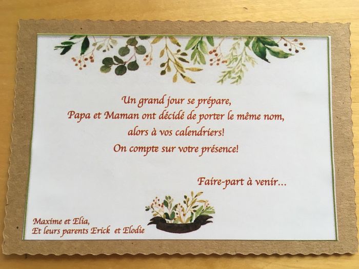 Bonsoir à toutes et à tous, Ca y est, après avoir reçues les photos de notre séance engagement, voici les save the date finalisés. Ils viennent d’etre Envoyés. Qu’en pensez vous? (J’ai volontairement masqué le visage de mes enfants 😉) Encore merci à...