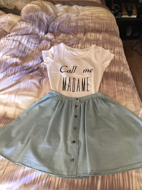 Voici le T-Shirt que j'ai fait sur internet pour le lendemain !J'hésite encore entre les 2 jupes, qui sont de toute façon déjà dans mon dressing (s'il fait mauvais temps j'opterai pour un jean et un blazer noir).Aux pieds, pour être à l'aise pour le...
