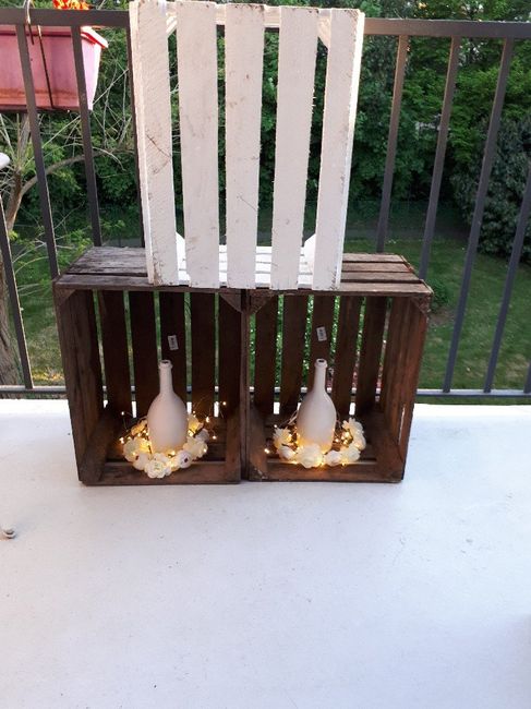 Voici mes vases pour les tables invités avec de la récup de bouteilles de vin j en ai fait aussi en rose pâle. Et j ai enfin trouvé mes palettes alléluia!!! Reste plus qu à trouver des cagettes en bois