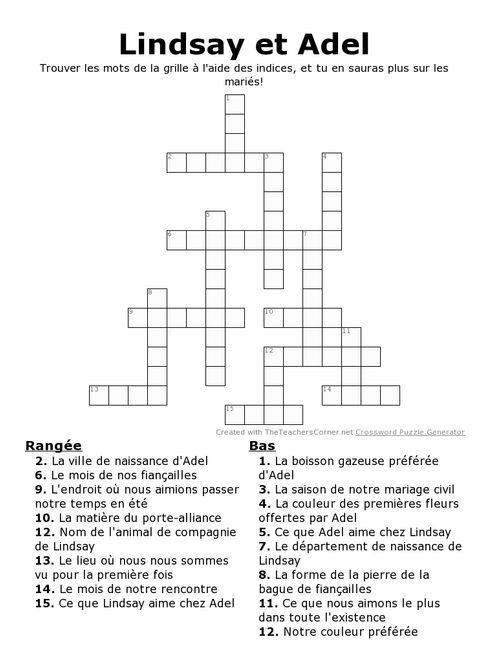 Coucou les filles! j'ai trouvé une idée d'animation sur le net. Un genre de mots croisés que je placerai en décoration de table. avec des questions sur nous ce qui encouragera les conversations entre nos 2 familles qui ne se connaissent pas. et la...